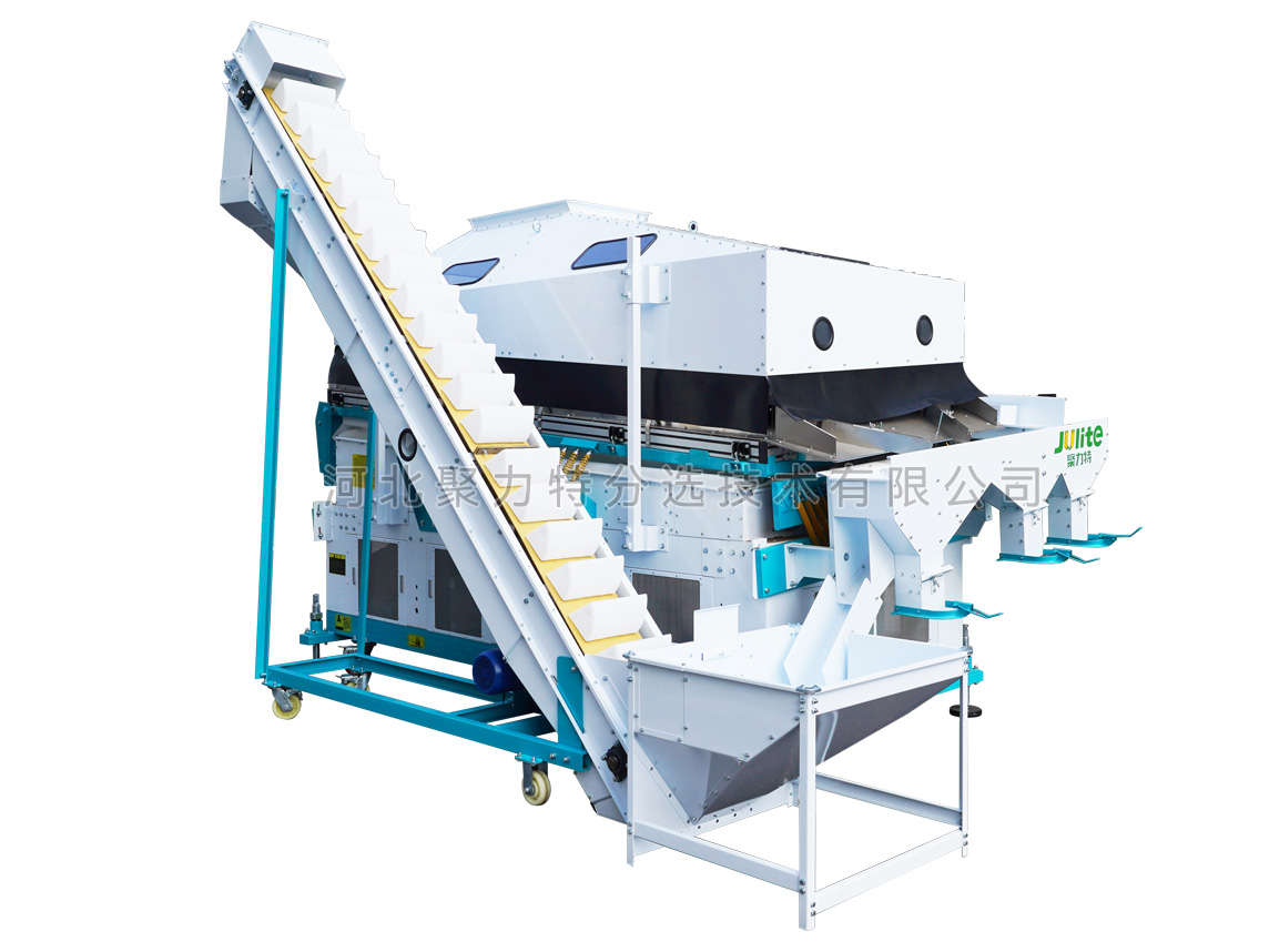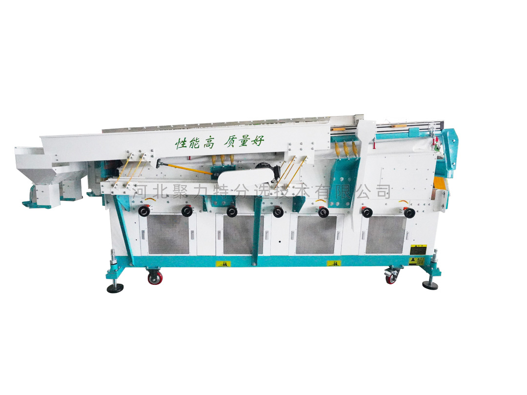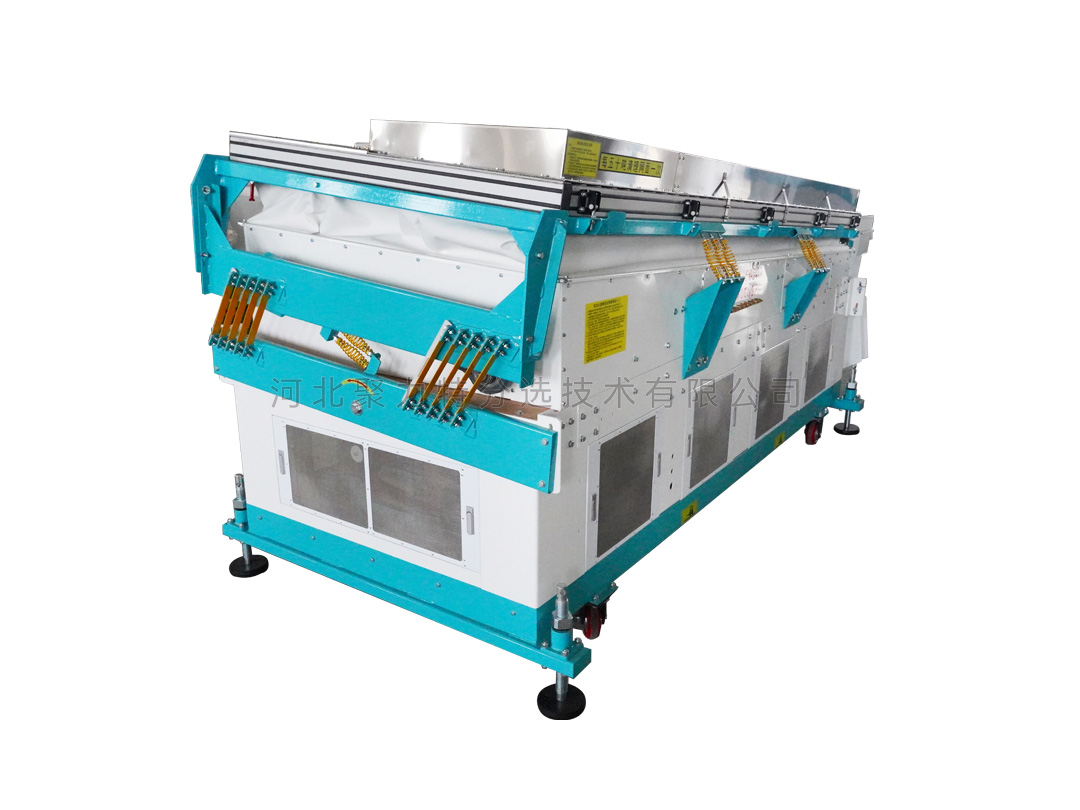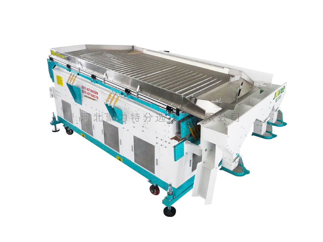 吹式比重精選機是根據(jù)物料在空氣動力和振動摩擦力的雙重作用下產(chǎn)生比重偏析的原理,通過調(diào)整風壓、振幅等技術(shù)參數(shù),使比重較大的物料沉到底部貼著篩面由低向高運動;比重較小的物料懸浮在表面由高向低運動,從而達到比重分離的目的。有效去除物料中的秕籽、芽籽、蟲蛀粒、霉變粒、黑粉病粒等比重較輕的雜質(zhì);側(cè)面增加成品側(cè)出糧功能,增大產(chǎn)量;同時比重精選機振動臺面上部設(shè)有一個去石傾角,能將物料中的石子分離出來。