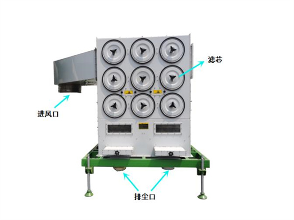 離心風(fēng)機(jī)吹出含塵氣流經(jīng)入風(fēng)口進(jìn)入脈沖除塵箱,由于除塵箱和外部風(fēng)壓差的存在,含塵氣流會(huì)迅速通過(guò)脈沖除塵箱內(nèi)3×3均布的9個(gè)濾筒后排入外部空氣中,氣流中的粉塵被阻擋在濾簡(jiǎn)外表面上,排入外部空氣中的則為過(guò)濾后的清潔空氣,最終完成含塵氣流的粉塵清除功能。脈沖噴吹控制儀接通脈沖電磁閥定期向?yàn)V筒內(nèi)部噴吹 0.6-0.8MPa 高壓空氣,高壓空氣由內(nèi)向外穿過(guò)濾筒,將附著在濾筒外表面上的粉塵除去,塵粒落入下部集塵斗,定期清理。