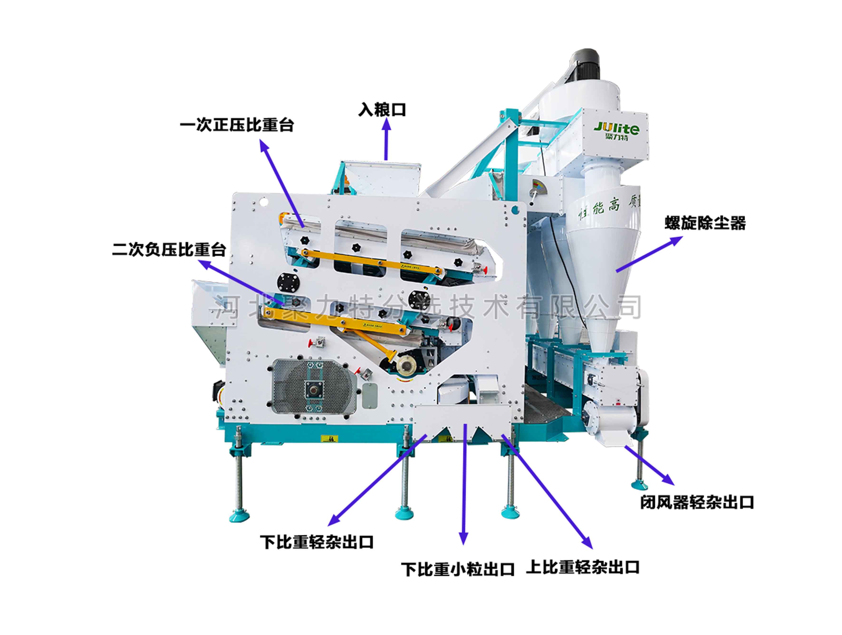 物料通過(guò)輸送設(shè)備經(jīng)喂入斗進(jìn)入第一道負(fù)壓比重臺(tái),通過(guò)風(fēng)選去除物料中的粉塵、糠殼等輕雜質(zhì),輕雜經(jīng)風(fēng)道、螺旋除塵器,由閉風(fēng)器排出收集;通過(guò)比重選有效去除物料中的秸稈、軸塊等比重較輕的雜質(zhì)。后物料通過(guò)導(dǎo)糧機(jī)構(gòu)進(jìn)入第二道正壓比重臺(tái),通過(guò)調(diào)整風(fēng)量、擋板位置等進(jìn)行比重加工,有效去除物料中的碎粒、秕籽、芽粒、蟲(chóng)蛀粒、霉變粒等雜質(zhì)。最終成品從比重臺(tái)高處排出。